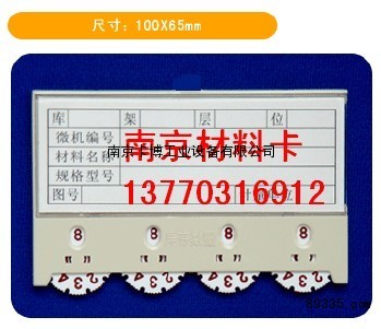 磁性货架卡、磁性材料卡、磁性防水卡--南京卡博仓储设备有限公司 0 2 5 - 8 5 2 3 5 4 6 3 / 8 5 2 3 5 4 6 5 /1 3 7 7 0 3 1 6 9 1 2/1 3 0 6 2 5 5 4 0 9 9/1 8 9 1 3 9 3 6 9 8 2 由ABS工程塑料制成,广泛应用于机关、企事业单位的仓储管理。它背面特有的强磁材料,可以直接吸附在货架上,下部有记录库成量的转盘,规格有A、B、C、D、E、F、G、H、等,可以使它直接吸附在铁质货架上,上半部份插卡片,记录材料名称、规格、型号,下半部份转盘显示库存数量,转盘有定位,有A型、B型、C型、D型、E型、F型、G型、H型、K型,E型可以直接记录入库、出库、库存量,适用于企业的认证、升级、创一流。该产品经全国各地供电局、电厂、炼油厂、钢铁厂、造纸厂、电子企业、机械制造业、自来水公司等单位使用效果良好.敬请来电来函联系.更多详细资料请登陆我公司网站,谢谢!--南京卡博仓储设备有限公司