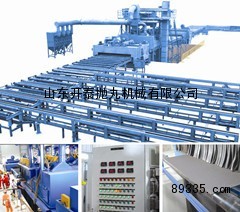 钢板抛丸清理机是一种钢板通过式自动抛丸清理设备。通过抛丸清理后,工件表面的氧化皮漆皮及其它杂质均被清理掉,使工件露出金属本色。同时通过抛丸清理还可以消除工件的内应力,提高工件的抗疲劳强度。另外,由于抛丸将工件表面杂质清除了,并且造出了有利于涂装的粗糙度,增强了喷涂时表面涂层的附着力,延长了喷涂寿命,提高了整个表面及内在的质量。钢材预处理线工艺是指钢材在加工前(即原材料状态)进行表面抛丸除锈并涂上一层保护底漆的加工工艺。钢材经过预处理可以提高机械产品和金属构件的抗腐蚀能力,提高钢板的抗疲劳性能,延长其使用寿命;同时还可以优化钢材表面工艺制作状态,有利于数控切割机下料和精密落料。此外,由于加工前钢材形状比较规则,有利于机械除锈和自动化喷漆,因此采用钢材预处理可大大提高清理工作的效率,减轻清理工作的劳动强度和对环境的污染。
