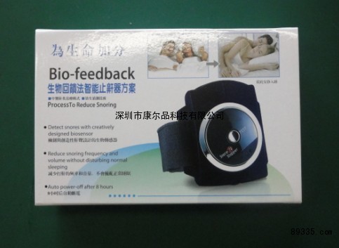 腕式电子止鼾器是一项采用生物回馈的自我训练模式。来降低或减少打鼾行为的一种物理康复仪器。它的过程是透过止鼾器上的微型生物声频侦测器,在侦测超过70+5dB的鼾声10=1秒以上,控制IC即启动脉冲输出机制,以温和的可调的电子针灸方式,透过皮肤送达运动神经,再不吵醒使用者的前提下,促使使用者因反射作用产生变换睡姿,达到抑制和减少打鼾的功效。本品还有省电功能设计,当超过30秒以上侦测不到鼾声时,则自动关机。而累积使用8小时以上即自动关机。只要持之以恒地使用本品,就能达到满意的效果
