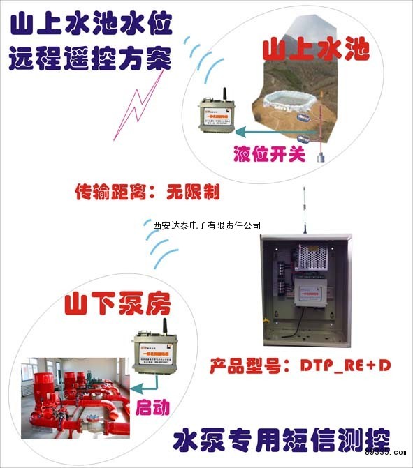DTP_RE+D 测控终端利用 GSM 网络,以短信的方式向山下控制的手机号码发送报警短信,控制其收到短信后,可以通过其继电器输出信号驱动水泵控制器启停,同时使对应的指示灯闪亮,还可以向操作员手机发送报警短信。