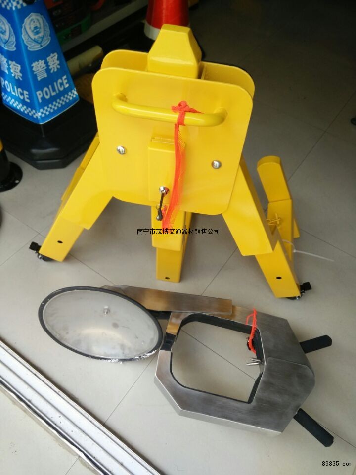 三叉重型车轮锁,主要为重型拖挂车、泥头车、大型货柜车、大客车、楂土车等大马力车辆专门打造的专用车轮锁。安全性能高、整体性能牢固、承载力度大、锁紧力强,锁体非常坚固,可经受任何工具的砸撬而不会对锁体造成损坏。本锁使用粗壮三条矩形无缝钢管制造,钉罩盘使用双层5MM优质钢板冲压制成,锁体重达28.5KG,坚固耐用。