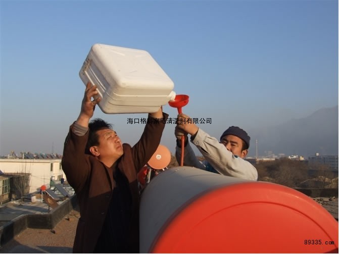 2、 将产品稍微稀释成水溶液,把稀释后的除垢剂溶液从水箱的溢水口或水箱上方排气孔加入存水箱;
