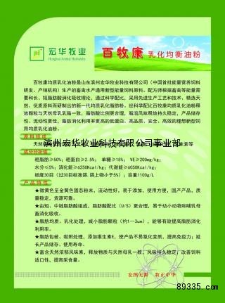 百牧康均质乳化油粉是山东滨州宏华牧业科技有限公司(中国首批能量营养饲料研发、产销机构)生产的畜禽水产通用新型能量饲料原料。配方师根据畜禽等能量需要和长、短脂肪酸消化吸收理论,通过科学配比,采用先进生产工艺和技术、精选天然、优质原料而研制出的新一代均质乳化脂肪粉。经科学配比百牧康均质乳化油粉释放颗粒与天然母乳乳脂一致,脂肪酸比例更合理,脂溶风味释放持久稳定,产品储存性、流动性更佳,脂肪消化利用率更高的低蛋白、高品质、安全、高效的理想新型饲用均质乳化油粉。