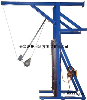 样品支架需靠墙安装,卷升支架安装在样品支架对面相距约2.5米处,钢丝绳将霰弹袋牵引至卷升架底部的减速电机,由控制框手动控制卷升机提升霰弹袋,至所需高度处后,手动控制开关释放霰弹袋实现摆锤冲击。
