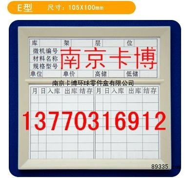 磁性材料卡-1 3 7 7 0 3 1 6 9 1 2-本产品由ABS工程塑料制成,广泛应用于机关、部队、企事业单位的仓储管理。它背面特有的强磁材料,可以直接吸附在货架上,下部有记录库成量的转盘,规格有A、B、C、D、E、F、G、H、等,尺寸有100*88、100*65、125*88、等可以使它直接吸附在铁质货架上,上半部份插卡片,记录材料名称、规格、型号,下半部份转盘显示库存数量,转盘有定位,有A型、B型、C型、D型、E型、F型、G型、H型、K型,E型可以直接记录入库、出库、库存量,适用于企业的认证、升级、创一流。该产品经全国各地供电局、电厂、炼油厂、钢铁厂、造纸厂、电子企业、机械制造业、自来水公司等单位使用效果良好.--13770316912 13260801879 025-85235465 85235463
