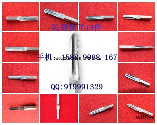 民用快开13件:进口威汉钢精做,和市面上几十元的货是天和地的差别。可单买。 配详细使用说明。 其实强开工具关键就是材料优质,做工标准,受力部分设计合理。 拥有这样的快 开工具那就会事半功倍,成功率高,顺手好用, 减小风险,节省成本。(本锁业这些工具头 子有几种材质加工,本站有市面上少见的德国进口的威汉钢加工的,有日本进口原材料加工 的,有国产原料加工的,不同的材质价格各不同,当然硬度和韧度也不同,本站从不对工具 做夸张声大.有意者请详谈)强开工具专为锁匠朋友急开锁提供,采用德国进口钢材特制而 成。