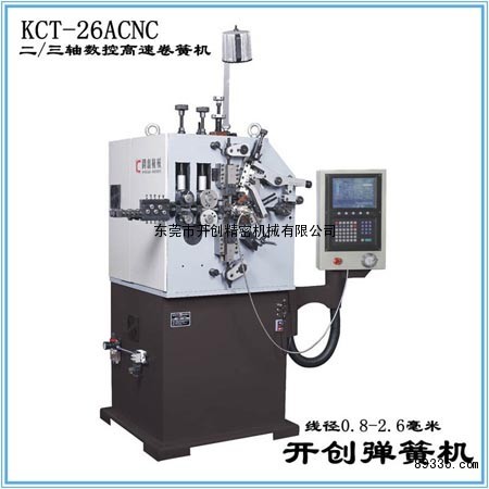 KCT-26A二/三轴高速数控卷簧机,简称26型弹簧机/26A压簧机/3.0卷簧机,其加工线径为0.8-3.0mm,适用于生产其线径范围内的各种压簧及相关线材成形产品,如压缩弹簧、电池弹簧、波形弹簧、塔形弹簧和喷头弹簧等。开创KCT-26A电脑压簧机主要是引用日本先进山洋伺服电机(Sanyo Servo Motor)、台湾电脑控制系统及高精密NTN/NSK/IKO轴承等构成,机身总共3轴,即送线轴、凸轮轴和螺距轴(可订配),各轴间可独立操作或同步运作,其中第三轴是针对弹簧机推杆间距刀而增加的,这样更方便弹簧成型,节省了调试机器的时间和线材成本,可以完成更具难度及要求的弹簧产品。开创KCT-26A数控卷簧机具有调试方便,弹簧成型速度快,生产效率高且稳定性强。