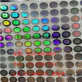 东莞市沃越防伪科技有限公司是专业生产和研发高新防伪科技产品的厂家,生产范围包括: 最新镭射图像产品的设计和按客人原样翻版制作,电码查询防伪产品更具人性化,镭射材料和电码防伪产品的膜压、打胶、模切、分条、印刷、喷码、版切包装到出厂,都是在全封闭式无尘车间生产操作,确保客户防伪产品的最优化。