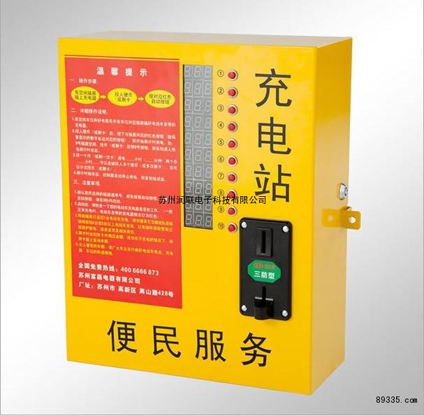 产品由一台控制器外加九个两孔84插座构成,控制器内装有电表及空气开关,主机具有钱币识别功能,识别率可达到99.7%。出厂设置只识别钱币(也能根据客户需要定制可使用代用币的机型)。并且控制器有九路供电通道,每路通道都有其独立的显示窗口与控制按键,用户在投币后,按下其中的一个控制按键,控制器就会给对应通道的插座供电,各通道的工作状态与工作时间,可以通过其对应的显示窗口显示出来。考虑为适应不同型号的电动车,控制器输出的是220V电源,给电动车充电时还是需要插接上电动车自带的充电器。