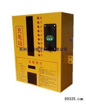 产品由一台控制器外加十个两孔84插座构成,控制器内装有电表及空气开关,主机具有钱币识别功能,识别率可达到99.7%。出厂设置只识别钱币(也能根据客户需要定制可使用代用币的机型)。并且控制器有十路供电通道,每路通道都有其独立的显示窗口与控制按键,用户在投币后,按下其中的一个控制按键,控制器就会给对应通道的插座供电,各通道的工作状态与工作时间,可以通过其对应的显示窗口显示出来。考虑为适应不同型号的电动车,控制器输出的是220V电源,给电动车充电时还是需要插接上电动车自带的充电器。