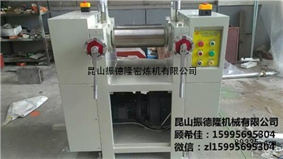 2.根据自己的胶种调节合适的辊距及左右挡板之间的距离,把橡胶放到两 辊筒间,放下上挡板;