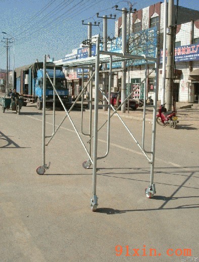 移动脚手架主要有主框,横框,交叉斜撑,脚手板,可调底座等组成。交叉拉杆又称斜拉杆、是纵向连接两副门架的交叉型拉杆。杆件两端压扁部分冲有销孔,组装时与门架立杆上的锁销锁牢。表面处理:电镀(冷镀锌)、浸锌(热镀锌)脚轮:又称为地轮
