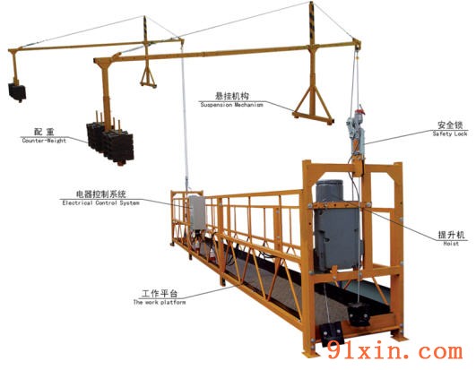 高空作业吊篮是用特制钢丝绳从建筑物上,通过悬挂机构,在爬升式提升机的作用下,使悬挂吊篮沿立面上下移动的一种比较特殊的建筑施工用工机械。它主要用于建筑外墙抹灰、贴面砖、安装玻璃幕墙、粉刷、涂料、油漆、清洗、维修,安装固定在外墙或筒壁上的标志、设施。也可用于罐体、桥梁、大坝、冷却塔、烟囱、铁塔。船泊等建筑物的外壁维修,清洗油漆,深井作业等。 是理想的高空作业建筑设备。